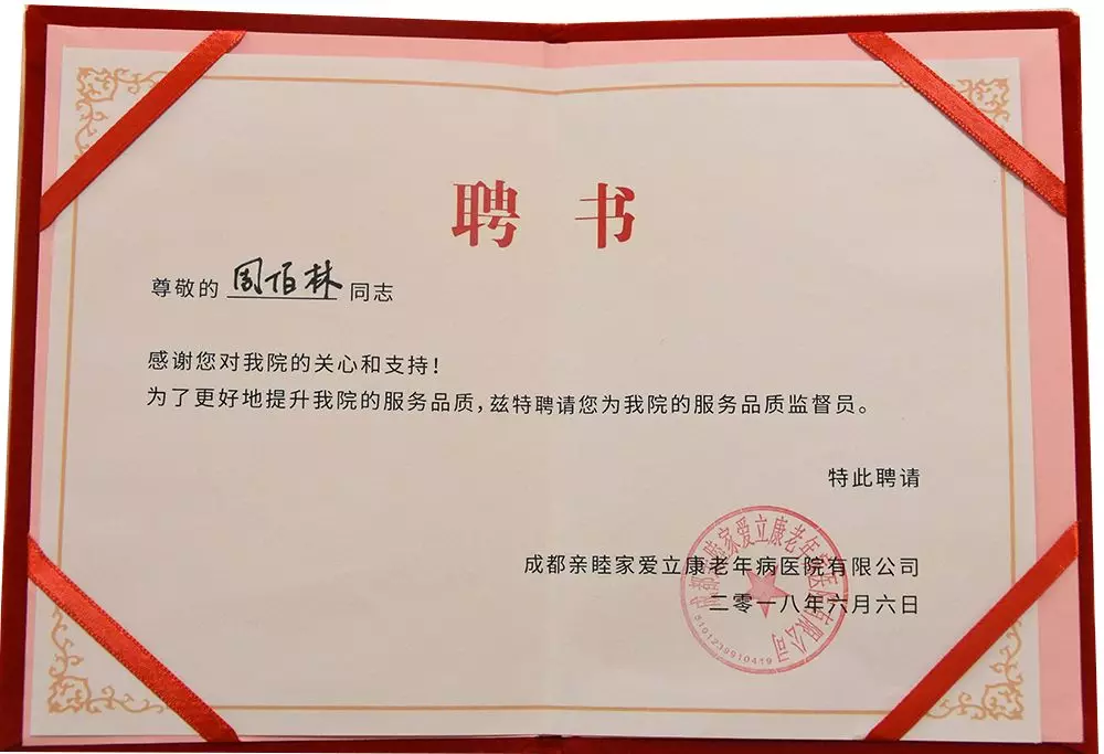 2018年6月14日,为了更好地提升医院的服务品质,亲睦家·老年医院聘请芙蓉古城业主周柏林同志为亲睦家·老年医院的服务品质监督员;